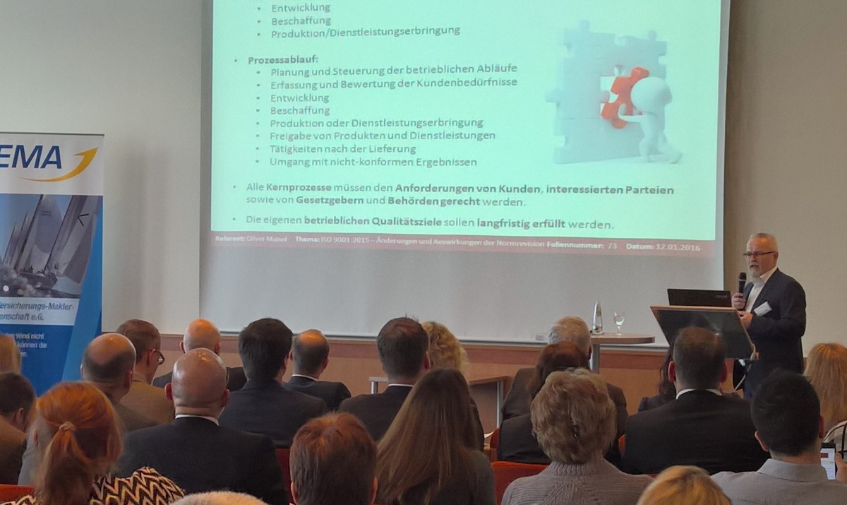 "Evolution im Qualitätsmanagement": Was bedeutet die neue ISO 9001:2015 für Qualitätsmakler? Diesen und anderen Fragen widmeten sich ca. 100 zertifizierte Versicherungsmakler auf der Jahrestagung in Fulda am 27. Januar 2017, an der auch unser Qualitätsmanagementbeauftragter teil genommen hat. Weitere Themen waren Unternehmens- und Marketing-Strategien und deren Umsetzung, insbesondere Techniken zur Verbesserung des Unternehmens anhand der SWOT-Analyse.